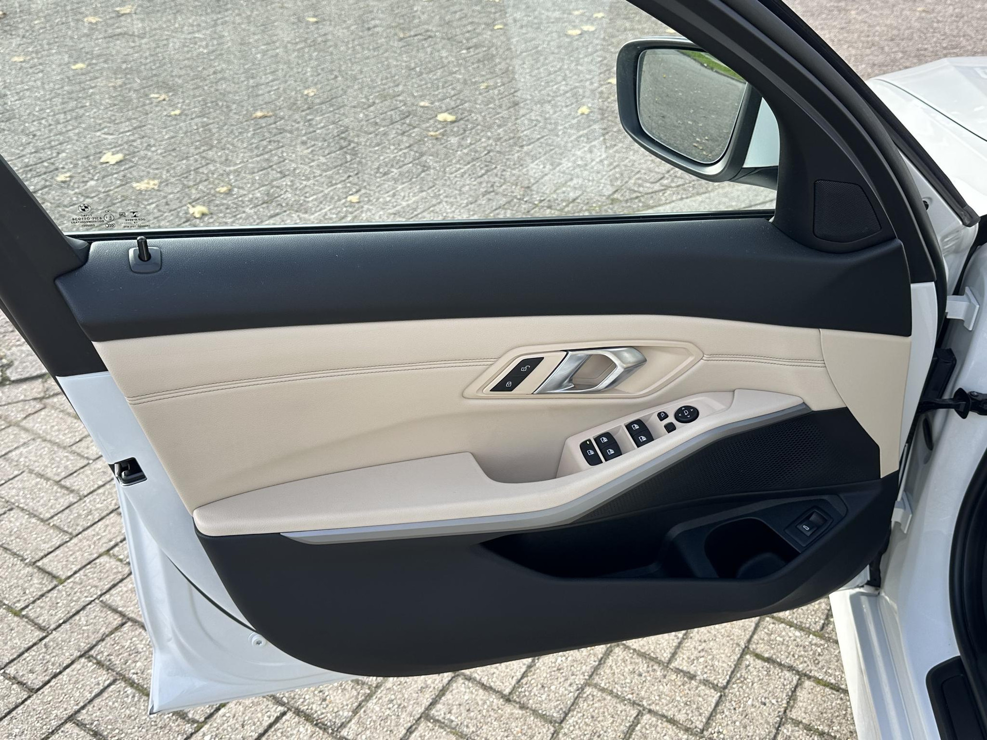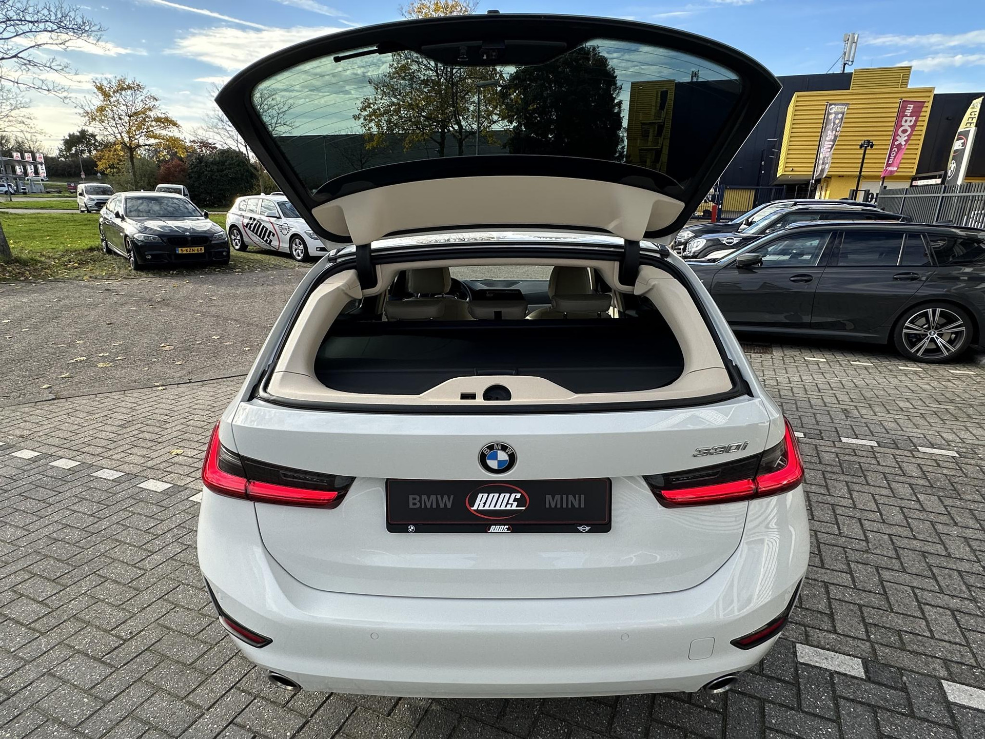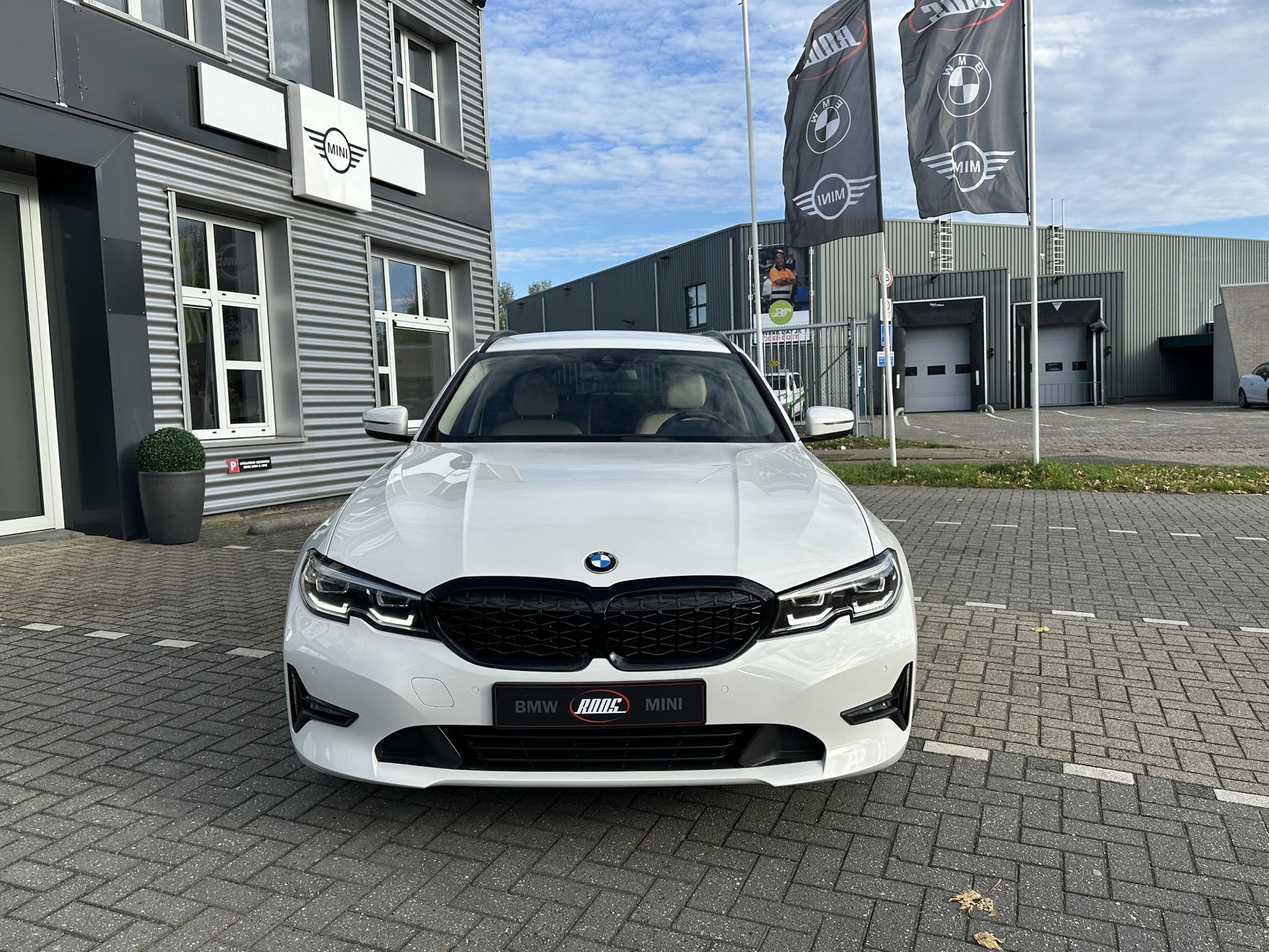 BMW 330I touring in Alpinweiß, Automaat met 258 pk en prachtig beige lederen interieur en 19 inch M-sportwielen.